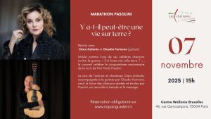 Récital avec Clara Galante et Claudio Farinone (guitare) Intitulé comme l’une de ses célèbres chansons contre la guerre, « C’è forse vita sulla terra ? » (Y a-t-il peut-être une vie sur terre ?), le concert célèbre le cinquantième anniversaire de la mort de Pier Paolo Pasolini. La voix de l’actrice et chanteuse Clara Galante, […]