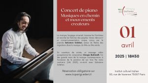 Un concert sur les migrations dans la musique, avec un mot du compositeur Giorgio Battistelli autour de son livre autobiographique : Per moto contrario Pont entre les cultures et les peuples, la musique favorise les rencontres, les échanges et les dialogues, puisant souvent son inspiration dans des pratiques, des instruments et des matériaux issus de […]