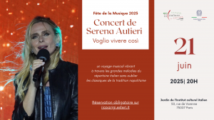 In occasione della Festa della Musica 2025, l’Istituto Italiano di Cultura di Parigi in collaborazione con il Consolato Generale d’Italia a Parigi è lieto di ospitare un concerto straordinario dell’attrice e cantante Serena Autieri, protagonista del palcoscenico italiano e interprete d’eccezione della tradizione musicale napoletana e del grande repertorio italiano. Accompagnata da un ensemble di […]