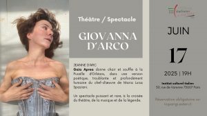L’Istituto Italiano di Cultura di Parigi è lieto di presentare lo spettacolo Giovanna d’Arco, tratto dall’opera poetica di Maria Luisa Spaziani, con la regia e l’interpretazione di Gaia Aprea. Figura leggendaria sospesa tra storia e mito, Giovanna d’Arco continua a esercitare un potente fascino per il mistero che la circonda. Maria Luisa Spaziani, affascinata sin […]